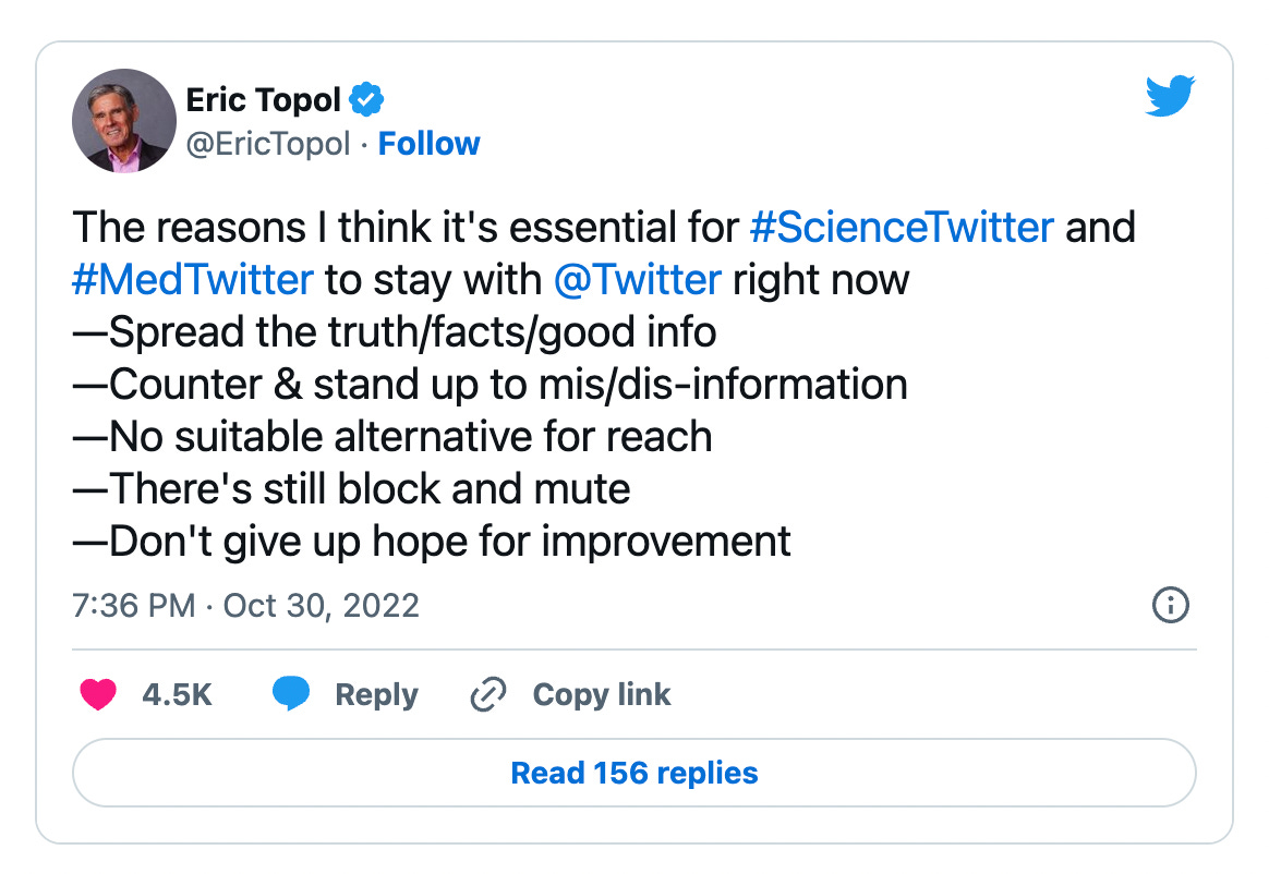 Eric Topol: Cardiologist, scientist, Twitter sleuth. Founder and director @ Scripps Translational Institute. Debunking medical myths and spreading truth in the Twittersphere. #FactsMatter.